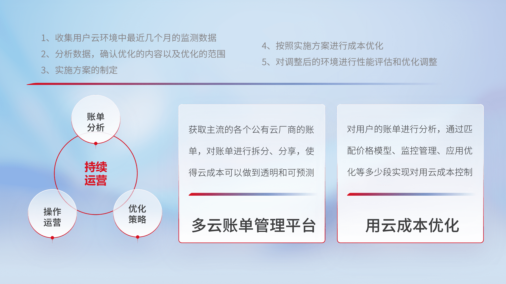 通过多云纳管,,以统一的资源数据模型把客户的云资源进行抽象和封装,,,,进而实现对多云资源的统一操作,,保障云资源管理的可靠性、、稳定性与可用性。。量身定制化运维内容,,,,配置、、、开发运维、、补丁管理、、、备份、、、监控、、认证和访问管理、、、、审计和日常巡检等,,保障在用云过程中的可靠度,,,,稳定度以及高可用率。。。